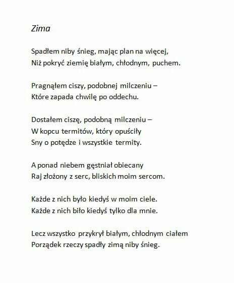 może spotkamy się jeszcze w tym innym świecie gdzie drzewami ku gwiazdom wzrastają o dobroci wiersze z mielonych ziaren ręką ojca zapach miłości w matczynych wypiekach budzi o świcie słów szlachetnych deszcze odmieniają każde zbłąkane serce może tam przytulę cię jeszcze przebaczenie