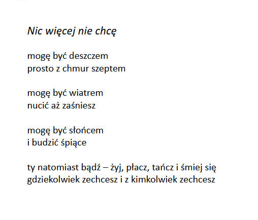 już nic nie będzie takie same chociaż piosenki liście drzewa... i ranek niby taki samy słowika głos co w drzewach śpiewa ślad po dzieciarni rozwrzeszczanej z naszych podwórek znikł już dawno bożek komputer zbiera peany samotnych jest omamić łatwo agresja kwitnie na ulicach młodzi robotą są zajęci jakieś rozmowy biblię czytać już nie zostaną oni święci media sterują społeczeństwem że koniec świat wojna będzie bo ludzie muszą mieć zajęcie by nie myśleli samodzielnie pozdrawiam -
