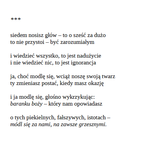 Ostatni mój wiersz tu opublikowany napisałem w oparciu o "Mistrza I Małgorzatę" M.Bułhakowa. Ten wiersz również jest pełen nawiązań do pewnego opowiadania jednego z moich mistrzów. Jeśli ktoś śledzi moje wiersze i prozę to może łatwo zgadnie autora i tytuł tego opowiadania. Jestem ciekaw czy ktoś zgadnie. Jesteś wyprutym z uczuć, nienawistnym, nieludzkim, zimnym potworem. Tak. Ale wiedziałaś o tym zanim sprawy zaszły za daleko. Zanim los skazał nas na siebie. Zanim coś kazało nam śmiać się do ekranu telefonu. Zanim sztucznie reanimowaliśmy, swoje serca Złożyliśmy, zdradzieckie podpisy pod aktem nic nie znaczącej miłości. Wysoki sądzie. Ja jestem nałogowym kłamcą. Nie potrafię patrzeć na człowieka jak na równego sobie. Nie mogę patrzeć inaczej niż z obrzydzeniem na drugą płeć. Więc jak miałbym ją kochać czy nawet zainteresować się nią. To nonsens. Sąd spojrzy. Zajrzy, bez lęku w mój umysł, seryjnych, morderczych planów i wizji. W centrum mózgu, przy wysokim i długim stole, siedzą moi przyjaciele. Po kolei ich Wam przedstawię. Najbliżej od nas po lewej. Rozsiadła się młoda i pełną wigoru, lekko roztrzepana i mająca problemy z utrzymaniem na dłużej jednego nastroju - księżniczka Podłość Naprzeciw niej, jej siostra bliźniaczka, mająca od wieków zły humor, małomówna i patrzącą na wszystkich z pogardą - księżniczka Wrogość Obok po prawej ręce Wrogości, zasiadła stara jak sam świat matrona, która zawsze wszystkich wyśmiewa, karci i poniża. Nawet tu przy stole nie ma przyjaciół czy orędowników. Bezlitosna i zimna - hrabini Nienawiść Naprzeciw niej usadowiono, postawnego i wydawać by się mogło dystyngowanego i eleganckiego dżentelmena bez skazy w urodzie i postawie. Jest tak samo małomówny jak Wrogość lecz widać w jego ruchach znudzenie spotkaniem i stalowe zimno w oczach. Ma on jednak sekrety, które spowodowałyby niesmak i zgorszenie nawet w tym osobliwym towarzystwie - oto hrabia Sadyzm Po jego lewej jego kuzynka i najbliższa przyjaciółka. Odziana w najlepsze suknię, bogato obsypana złotem i klejnotami. Pijana, zabawia wszystkich swoimi historiami. Zawsze najlepsza i nieomylna. Wiecznie uśmiechnięta - arcyksiężna Przebiegłość Naprzeciw niej najgorszy dla niej kompan do zabawy i rozmowy. Stary, nestor rodu i wybitnie surowy i pamiętliwy sędzia wszystkich zebranych. Tak naprawdę skupiony jedynie na sobie i swoich wygodach. Zachowujący jedynie odpowiedni rezon do ostatniej postaci u góry stołu. - książę Egoizm U góry stołu, nad zebranymi, z czarnego atłasu powleczonego tronu, wionie najdzikszą grozą i lodowatym strachem, pierwotnych lęków. Nawet zebrani rzadko skupiają wzrok na postaci rozpartej dumnie na tronie. Niewiele do niej mówią a jeśli już to przyjmują najbardziej delikatny i służalczy ton na jaki ich stać, nawet stara Nienawiść korzy wzrok w swe czarne pantofle i kłania się bez słowa, wyżej w hierarchii postawionej istocie. Korona ze szczerego złota zdobi jej skronie, nie stroją jej jednak żadne kamienie a drobinki dusz potępionych. W ustach płomień piekielnej kaźni jej gore. A głos jej jak trąby okrutnych podziemi, pod którym kruszeją serca i wola. Oto tajemnicza, sprawiedliwa a zarazem bezduszna i apodyktyczna - Królowa światów. Jej Wysokość Śmierć. W najczystszej, demonicznej postaci. Ona mną włada. Ona jeśli chce mnie gnębi i dzieli na atomy poddaństwa. W każdej komórce mojego ciała czuć jej władztwo i siłę. Jej niezachwianą potęgę. Ty uprowadziłaś i zamordowałaś bez litości. Małą, bezbronną dziewczynkę - księżniczkę Wierność. Na wieść o tym Śmierć wydała natychmiastowy wyrok. Wezwała przed swe oblicze arcyksiężną Skruchę. Hrabia Sadyzm i hrabini Nienawiść, wyprowadzili ją do sąsiedniego gabinetu. Nikt już jej więcej nie widział ani o niej nie wspomniał