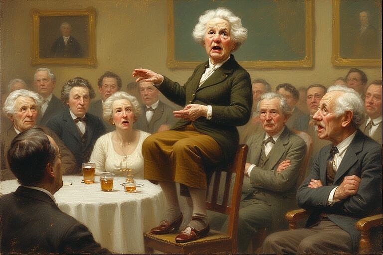 Była nauczycielką, z dekadę temu i to jej jako farsa zostało, Albo jeszcze gorzej, nawet dawniej powołanie tak się u niej zdeprawowało. „Dziś” mówi do osoby pojedynczej i dorosłej zwracając się jak do klasy, – Co najwyżej nastolatków, najmniej trzydziestoosobowej rozbrykanej masy, Której masie musi wyłożyć o „Sonetach krymskich”, więc „ex cathedra” usadza. Lecz to co mogło mieć dawniej podstawy, dziś w dziedzinę psychiatrii język wsadza, Przez co raz mówienie o osobach i do osób o pokolenie starszych: „Dziecko!” – Tak nadzwyczajnie wyraziście, ze wzgardą, demaskując złą postawę zdradziecko. I wciąż wszystkimi chce rządzić, bo od wszystkich dokoła mędrsza zda się sama sobie, Tylko, że bardzo zmienił się wiek tych osób! Choć butnie kazałaś, ja tak nie zrobię! Prócz formy, bo treść wykładu (stąd „kazań”) w każdym punkcie z prawdą sprzeczna była. – A dobry nauczyciel wykłada prawdę, nigdy przeciwnie, choćby bardziej miła! Ilustrował „Perchance” (pod moje dyktando) grafiką „Wykład jak dzieciom dorosłym”.-
