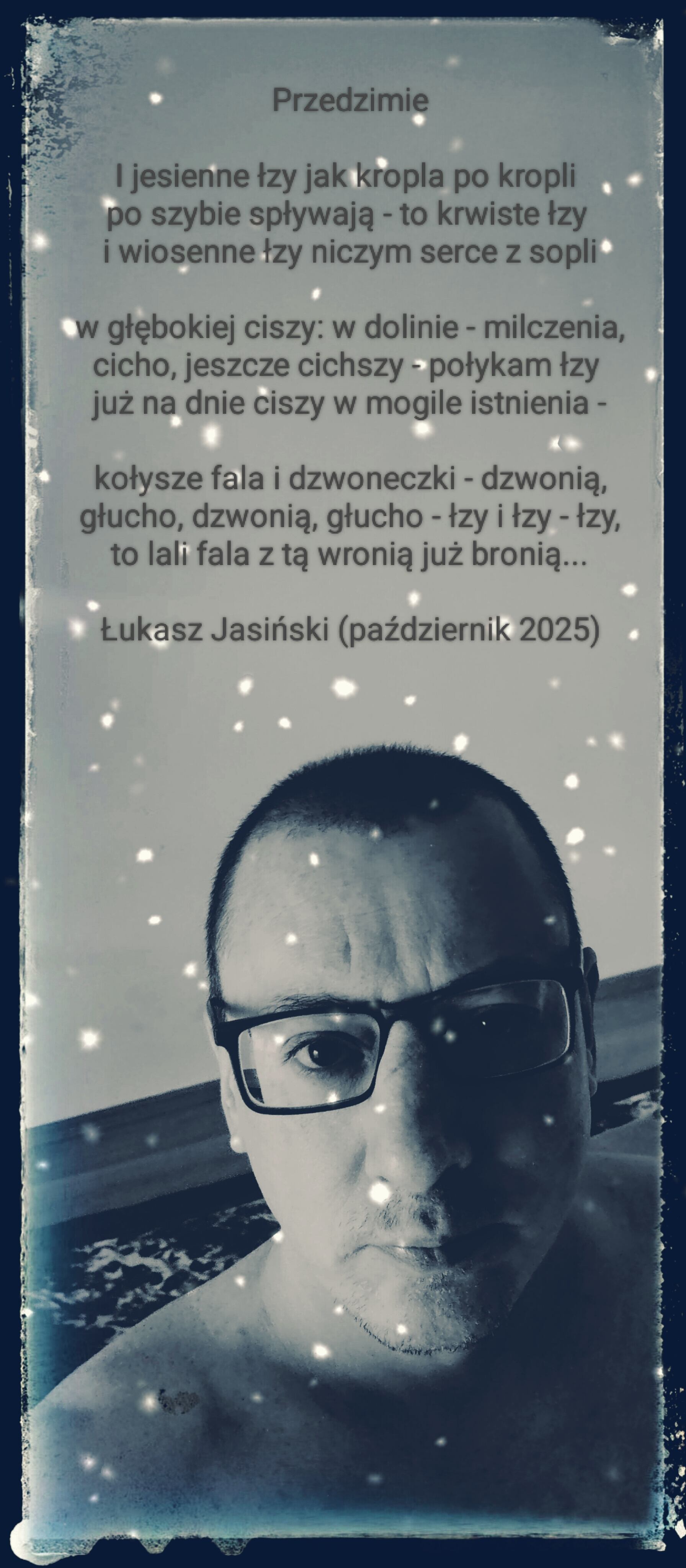 Przedzimie* I jesienne łzy jak kropla po kropli po szybie spływają - to krwiste łzy i wiosenne łzy niczym serce z sopli w głębokiej ciszy: w dolinie - milczenia, cicho, jeszcze cichszy - połykam łzy już na dnie ciszy w mogile istnienia - kołysze fala i dzwoneczki - dzwonią, głucho, dzwonią, głucho - łzy i łzy - łzy, to lali fala z tą wronią już bronią... *więcej informacji Państwo znajdą w następujących esejach: "Komentarz - komentarz odautorski" i "Mój drogi świecie" - Autor: Łukasz Jasiński (październik 2025)