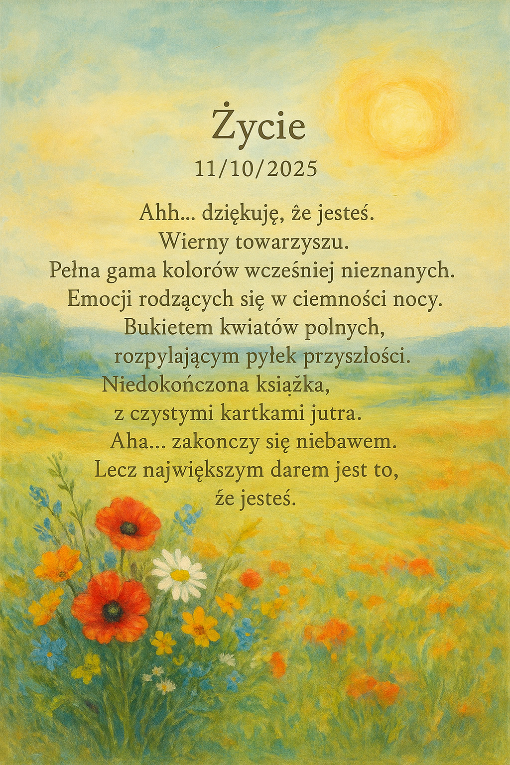 „Życie” 11/10/2025 Ahh… dziękuję, że jesteś. Wierny towarzyszu. Pełna gama kolorów wcześniej nieznanych. Emocji rodzących się w ciemności nocy. Bukietem kwiatów polnych, rozpylającym pyłek przyszłości. Niedokończona książka, z czystymi kartkami jutra. Aha… zakończy się niebawem. Lecz największym darem jest to, że jesteś. Michał Czachorowski