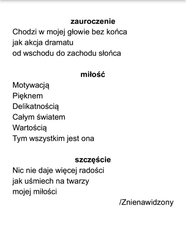 Nie lubię być z tobą o brzasku i przed snem, kiedy noc tuli łunę księżyca Nie lubię kiedy milczysz znacząco lub gdy zadajesz za dużo pytań Nie lubię też kiedy smutna jesteś lub radość ciebie rozpiera i kiedy nucisz ballady gdy czytasz mi Homera Nie lubię gdy śpisz po południu bo jesteś pracą zmęczona i kiedy czytasz mi wiersze próbując mnie do nich przekonać nie lubię też kiedy słuchasz uważnie gdy dajesz mi wolność, przestrzeń nie lubię kiedy patrzysz rozważnie a twój wzrok moje słowa pieści nie lubię ciebie w domowym stroju nie lubię gdy wyglądasz ładnie Nie lubię a w tym nie – lubieniu z tęsknoty przepadłem4 punkty