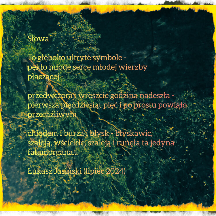 Słowa* To głęboko ukryte symbole - pękło młode serce młodej wierzby płaczącej - przedwczoraj: wreszcie godzina nadeszła - pierwsza pięćdziesiąt pięć i po prostu powiało przeraźliwym chłodem i burza i błysk - błyskawic, szaleją, wściekłe, szaleją i runęła ta jedyna fatamorgana... *więcej informacji Państwo znajdą w następujących esejach: "Komentarz - komentarz odautorski" i "Mój drogi świecie" - Autor: Łukasz Jasiński (lipiec 2024)6 punktów