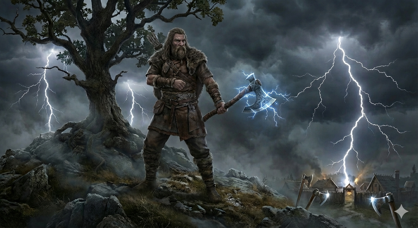 To był czas gromu, z niebios uderzony, gdy niebo pękło pod biczem płomieni. Świat stanął nagle, blaskiem oślepiony, w huku uderzeń świt ziemię odmienił. Dąb wyrósł z wiary, porośnięty siłą, na szczytach wzgórz, gdzie srogie wichry gonią. To, co się w lęku przez wieki ukryło, trwa teraz mocno pod Peruna dłonią. Tu nie ma trwogi, co nie jest już męstwem, ani milczenia, co nie brzmi wyrokiem. On karze zdradę i włada zwycięstwem, patrząc na ziemię swym surowym okiem. Niechaj topory lśnią na skraju świata, gdzie sprawiedliwość wykuwa się w huku. On jest tym prawem, co narody splata, cięciwą napiętą na gwiezdnym łuku. Perun w mitologii słowiańskiej to najwyższy bóg, władca niebios, piorunów, burz, wojny i sprawiedliwości. Jako gromowładca, utożsamiany z siłą i porządkiem, był jednym z najważniejszych bóstw, często przedstawianym z toporem. Jego symbolem był dąb (męskie drzewo życia). Obraz wygenerowany AI3 punkty
