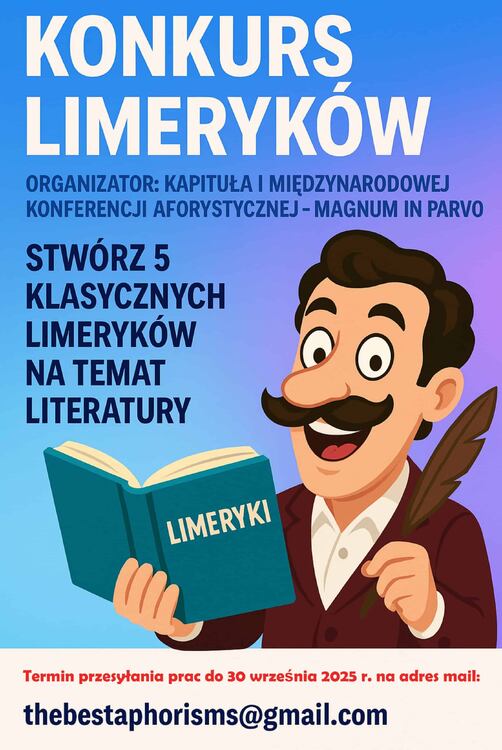 Na prośbę organizatorów, publikujemy informacje o konkursie: Konkurs limeryków „Magnum in Parvo” - Stwórz 5 klasycznych limeryków na temat literatury Termin przesyłania prac do 30 września 2025 na e-mail: [email protected] Regulamin konkursu: 1. Organizator konkursu Organizatorem konkursu jest Kapituła Konkursowa I Międzynarodowej Konferencji Aforystycznej Magnum in Parvo we Wrocławiu z afiliacją przy Uniwersytecie Wrocławskim. Strona internetowa: www.magnuminparvo.com 2. Cel i temat konkursu Celem konkursu jest promocja krótkiej formy literackiej oraz twórczego podejścia do literatury. Zadaniem uczestników jest stworzenie 5 klasycznych limeryków na temat literatury. 3. Uczestnicy Konkurs ma charakter otwarty i jest adresowany do osób pełnoletnich z Polski i z zagranicy. 4. Kryteria oceny Prace konkursowe będą oceniane pod względem: a) poprawności formy limeryku: Liczba wersów: 5. Układ rymów: aabba. Treść: Nonsensowna, humorystyczna, często z elementami groteski, kalamburów i gier słownych. b) adekwatności tematyki do tematu konkursu. 5. Jury konkursu W skład jury wchodzą: prof. Jan Miodek – przewodniczący, Andrzej Majewski - pisarz, Urszula Zybura - poetka. 6. Zasady nadsyłania prac Każdy uczestnik może zgłosić tylko jeden zestaw 5 limeryków. Prace należy przesłać drogą elektroniczną na adres: [email protected] do 30 września 2025 r. Zgłoszenie powinno zawierać dwa pliki: a) plik z limerykami opatrzonymi godłem w nazwie pliku (np. limeryki_kaktus.pdf), b) osobny plik z danymi autora (imię i nazwisko, adres e-mail, numer telefonu, ewentualna afiliacja) podpisany tym samym godłem (np. dane_kaktus.pdf). 7. Wyniki i nagrody Laureaci zostaną poinformowani drogą mailową do 15 października 2025 r. Oficjalne ogłoszenie wyników odbędzie się 25 października 2025 r. na stronie internetowej konkursu. Tego samego dnia odbędzie się uroczysta gala wręczenia nagród na Uniwersytecie Wrocławskim. Przewidziane są nagrody finansowe oraz książkowe. Ostateczny podział nagród ustala organizator. 8. Prawa autorskie i zgoda na publikację Uczestnik oświadcza, że nadesłane limeryki są jego autorstwa i nie były wcześniej publikowane ani nagradzane. Udział w konkursie oznacza zgodę na nieodpłatne publikowanie zgłoszonych limeryków przez organizatora w materiałach promocyjnych i pokonferencyjnych, z zachowaniem praw autorskich osobistych twórcy. 9. Postanowienia końcowe Uczestnictwo w konkursie jest równoznaczne z akceptacją niniejszego regulaminu. Organizator zastrzega sobie prawo do zmian w regulaminie oraz do unieważnienia konkursu w części lub całości w uzasadnionych przypadkach.