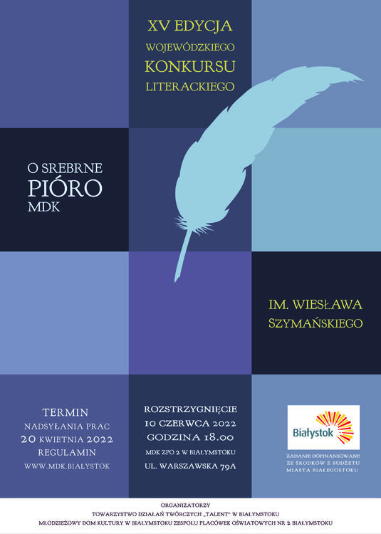 Serdecznie zapraszamy uczniów szkół ponadgimnazjalnych całego kraju do udziału w X edycji Konkursu Literackiego - O Srebrne Pióro MDK- im. Wiesława Szymańskiego. Na konkurs należy nadesłać zestaw trzech wierszy o dowolnej tematyce w terminie do 4 maja 2016 roku.