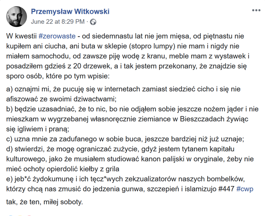 6. A propos #zerowaste - wczoraj nie spuściłem wody po klocku dla Planety, a i tak pewnie znajdą się tacy, co pod tym postem napiszą: a) Bączek ty wuju, nielegalną kozą palisz w mieszkaniu b) weź se lepiej jajca utnij debilu c) Swoje ego byś spuścił w kiblu d) Jakbyś do japy sobie nasrał, to dopiero byłoby #zerowaste e) Ja chciałbym tylko powiedzieć, że szanuję i przeczytałem wszystkie tomiki i też nie spuszczam Wiem, że to odejście od tematu, ale od razu przypomniał mi się ten wpis - strasznie mierzi mnie ta polska, nowoczesna lewica, której snobizm czuć już w samym tonie.