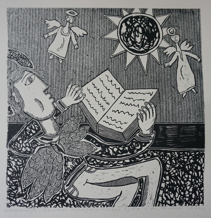 Mój Szemkel z linorytu czytający księgę życia jest buchalterem prowadzi kreatywną księgowość przemyca grzeszników do nieba od lat i w ten sposób oszukuje Boga mam nadzieję że uratuje mnie z ognia gdy się niebawem podpalę nie mam satysfakcji z życia ale wierzę jako seryjny samobójca w wyższą opatrzność kiedyś gdy szedłem w stronę końca świata (miejscowi wiedzą o furcie) miałem sznur w torbie by się wyhuśtać ale głos spod samochodu mnie powstrzymał nie widzę człowieka a tu pomóż mi słyszę zamiast się powiesić poniosłem pijaka dalej się śmiali znajomi uratował mi życie więc liczę na anioła nr siedem