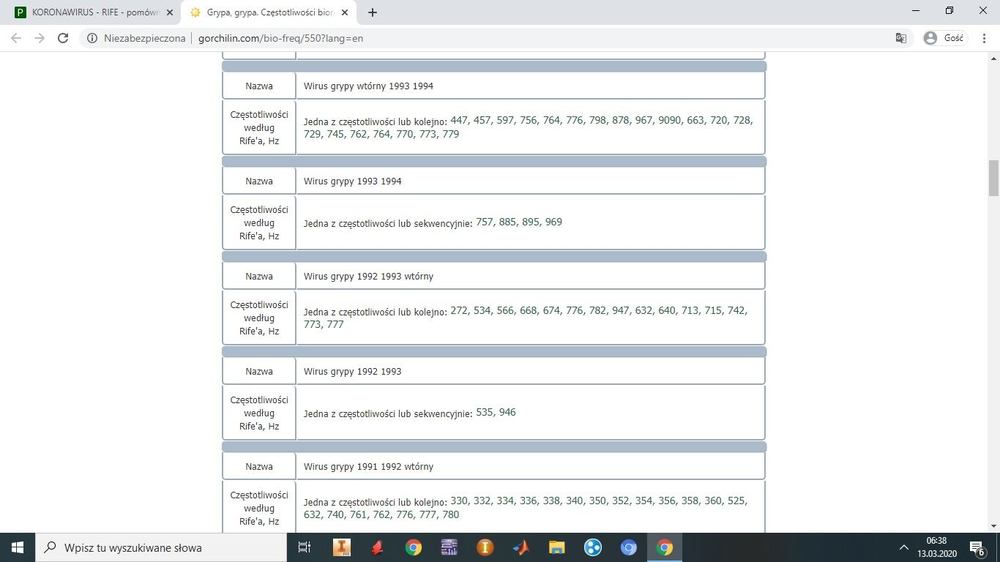 Przed chwilą przyszła mi do głowy taka myśl: Czy biorezonansem RIFE'A próbowano zwalczać wirusa zwykłej grypy (słyszałem o pewnym podobieństwie pomiędzy wirusem grypy i koronawirusem)? Bez najmniejszego trudu znalazłem, np. to: http://gorchilin.com/bio-freq/550?lang=en Czy coś z tego rozumiesz? Dla wszelkich szczepów wirusa grypy ustalono skuteczne częstotliwości. A dzisiaj żaden naukowiec mówiąc o KORONAWIRUSIE nie powiedział NIGDY słowa BIOREZONANS. Było tak na pewno. Bo ja tego nasłuchuję. Co gorsza nikt o to nie pyta, czekamy aż w jadłospisie koronawirusa pojawią się nasze płucka?