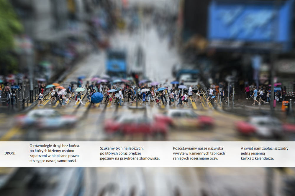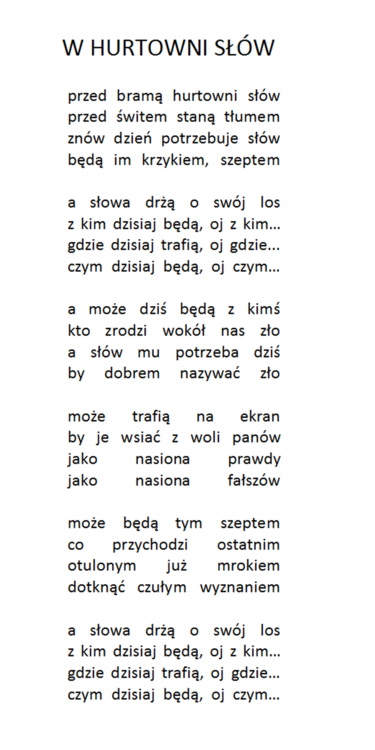 W półprofilu na linii cięcia brakuje kilku strzałek wektorów przyjaźni złości miłości to nic że nie pamiętam gdy ty nie pamiętasz dotknięć i urazów stygnących wolno w kroplach pomiędzy nami nad ziemią wykreślonych kilku słów z opisów namiętności nic że nikt nie tańczy z nami i bez nas co dnia zachody słońca są cudne w portretach przerysowanych wspomnień Jakoś tak, może jest bardziej płynie? -