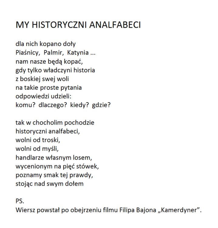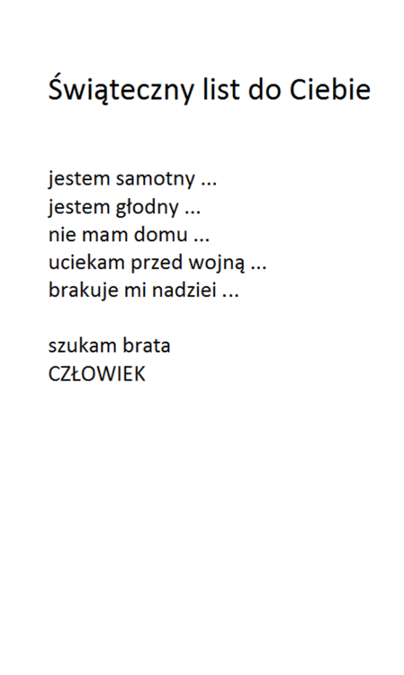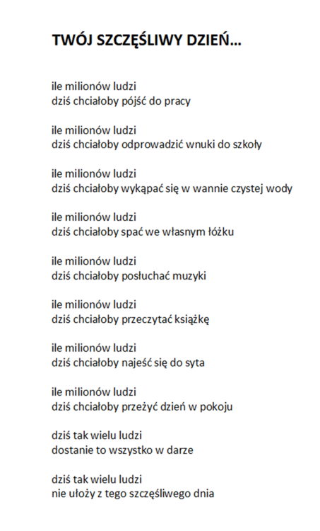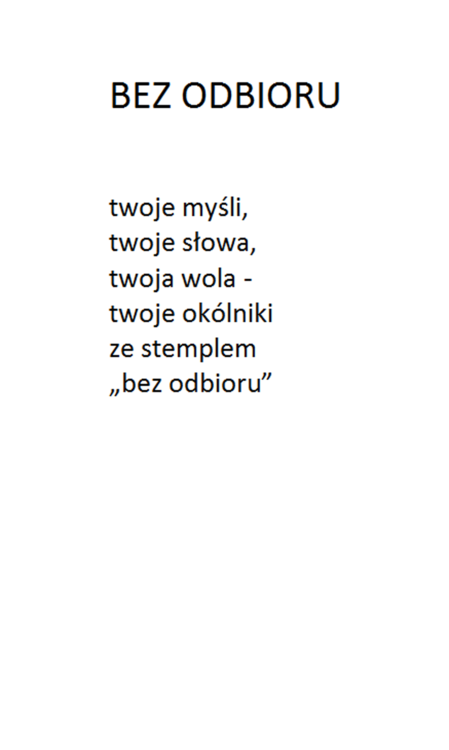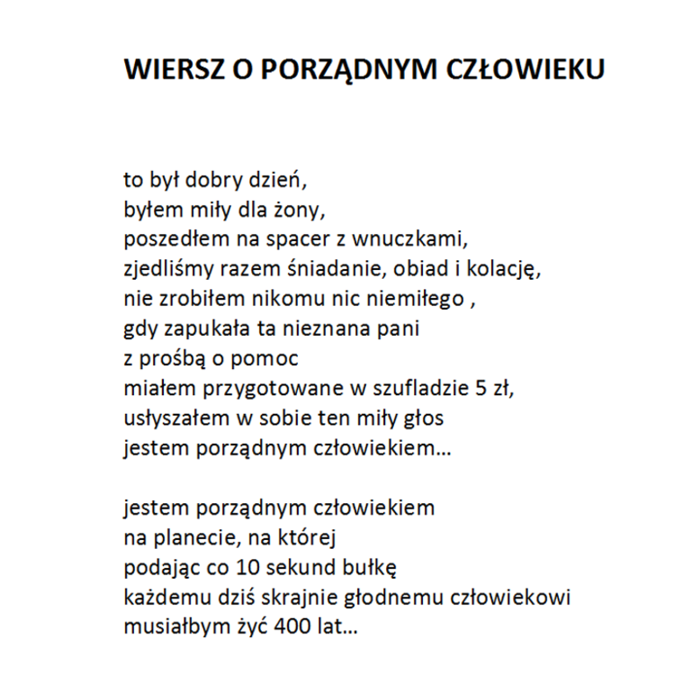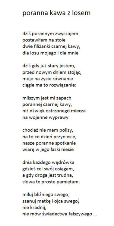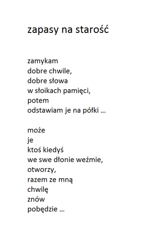 Bardzo dziękuję za nią. Wracając do mojego pomysłu. Gdy Autor otrzymałby post ze swoim nickiem w nazwie od Admina, to sam Autor decydowałby o formie prezentacji w nim swoich tekstów. Nie musiałaby to być forma graficzna. Ja wybrałem akurat graficzną, bo lubię jak jest coś w miarę ładnie się podaje :-). Uważam, że to zostało podane ładnie :-) Bardzo też cenie wygodę przeglądania, którą zapewnia zabudowana przeglądarka plików graficznych z bardzo wygodną obsługą manualną. Ważne jest też to, że wiersz "staje solo na scenie", wiec daje mu to możliwość silniejszego przekazu jego przesłania. Ale jeśli ktoś woli formę tekstowa, to w tym poście w postaci tekstu zapisuje swoje kolejne wiersze, jeden pod drugim.. I wilk syty i owca cała :-) W następnym komentarzu przedstawię wersje POCZYTAJ POLMANA w wersji bez grafiki, chociaż wiersze będą w formie obrazu graficznego, a to dlatego, by je przeglądać w tej przyjaznej przeglądarce plików graficznych. Aby otworzyć wspomnianą przeglądarkę, należy kliknąć na którymkolwiek z wierszy. Na telefonie trzeba oglądać w pozycji odwróconej. Telefon trzymany powinien być poziomo. Pozdrawiam :-)