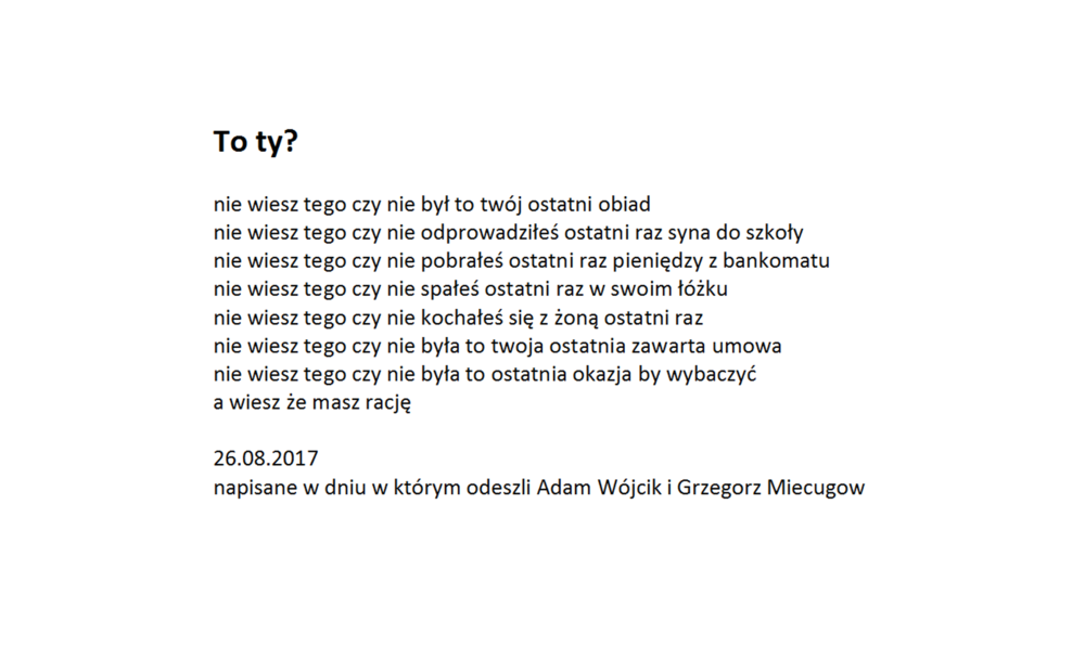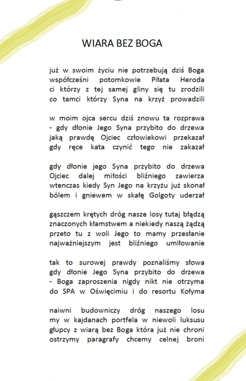 Jestem mordercą Tak dobrze słyszeliście Zabiłem Zabiłem myślą Zabiłem zaniedbaniem Zabiłem czynem Bo wiesz, w czym jesteśmy dobrzy? W skreślaniu W pokazywaniu palcem Wybaczyć to nie znaczy zapomnieć To nie znaczy udawać, że nic się nie stało Wybaczyć to kochać Kochać kogoś pomimo jego winy Jaka by ona nie była PS Obowiązkowo muszę coś wyjaśnić w związku z tym tekstem. Ale chwilowo to sekret :-)