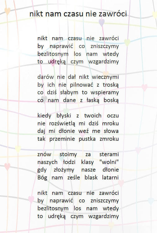 Coś mi się wydaje, że wyrok dożywocia wydany przez TSUE byłby wyrokiem łagodnym:-) Jeszcze mam kilka słów Ciebie szanowna Tetu. Wywołałem dyskusję. Aby nie było to tylko bezproduktywne strzępienie języka, chcę na koniec pokazać to, co było istotą mojej do Ciebie uwagi. To oryginalny tekst: wchodzisz w mój cień jakbyś chciał zostać na dłużej pozwolimy sobie za jakieś sto lat teraz mamy tylko chwilę i oczy zwrócone w naszą stronę zobacz jacy oni mali A tak po wspomnianych zmianach: wchodzisz w mój cień jakbyś chciał zostać na dłużej… pozwolimy sobie za jakieś sto lat teraz mamy tylko chwilę a oczy zwrócone w naszą stronę zobacz jacy oni mali albo wchodzisz w mój cień jakbyś chciał zostać na dłużej… pozwolimy sobie za jakieś sto lat teraz mamy tylko chwilę ich oczy zwrócone w naszą stronę zobacz jacy oni mali Są to dwie formy, moim zdaniem równoznaczne. Zmieniłem układ tekstu, a także w miejsce spójnika „i” dałem „a” bądź „ich”. Jak taki tekst rozumiem? Ona wierzy, że ich uczucie jest wielkie, że pragną być ze sobą, teraz los im nie pozwala na bycie razem. Teraz mają dla siebie tylko chwilę. Ona jest pewna, że uczucie przetrwa, będą na siebie czekać, choćby to miało trwać nawet sto lat. Ludzie, którzy na nich patrzą, nie wierzą w takie uczucie. On nie wierzą, bo oni zniszczyli już swoje. Temu teraz są tacy mali. I to by było na tyle. Pozdrawiam.