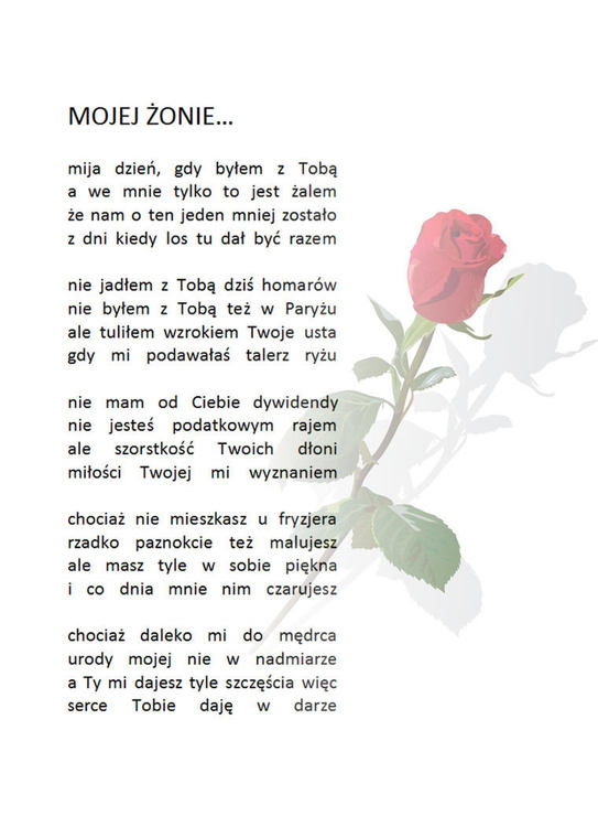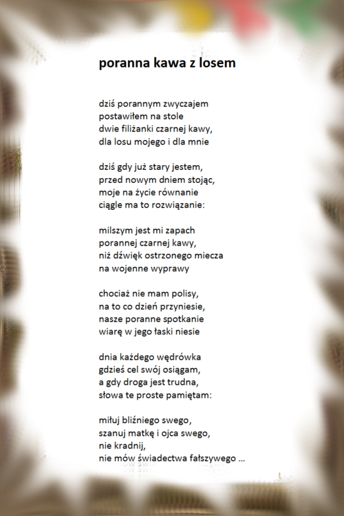 Miłe spotkanie szanowna @tetu. To chyba nasz pierwszy raz:-) Przesyłam w ten deszczowy i pochmurny poranek najserdeczniejszy z moich uśmiechów :-) Jak widzisz wdaliśmy się z Lehajem w tą dysputę. Postawiłem problem w związku z Twoim fragmentem wiersza: " teraz mamy tylko chwilę i oczy zwrócone w naszą stronę" Ten problem polega na tym, że zrodziła się taka wątpliwość: Czy w teraz gdy mamy tylko chwilę i oczy zwrócone w naszą stronę, to czy te oczy z nas wyszły i stanęły obok nas i wtedy zwróciły się w naszą stronę. Wydaje mi się, że osią problemu jest spójnik "i". A co sądzisz gdyby to "i" stało się "a" albo "ich". Jeden problem rodzi kolejne, Nie wiem jak poważny będzie nasz dyskurs i nie wiem co mam dziś zrobić z tą nalewką :-) A kochana Żona ma dziś wolny dzień i ona, (jak to każda żona :-)), nie znosi nierozwiązanych dylematów egzystencjalnych. To trzeba wyjść z siebie i stanąć obok, czy nie :-) @tetu serdecznie pozdrawiam i miłego dnia. Dla wszystkich też :-)