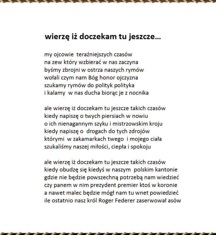 Szanowna @tetu utrzymywałem przez cały czas gotowość do poważnego dysputu. Z pewnym niepokojem obserwowałem poziom nalewki w butelce. Ten widok budził mój niepokój o dalsze losy tej gotowości. Ale dotrwałem. Prawie już na oparach:-) Wracając do meritum. Oś problemu jest wyraźnie zarysowana. Proponuje przekazać problem Poetyckiemu TSUE do rozpatrzenia. Poznajmy opinię forum w tej kwestii! A nalewka jest mocna. Lekko cierpka i nie za słodka. Extra!!! Gdybyśmy ją skosztowali razem, to myślę, że oś problemu by nie wytrzymała:-) Konsensus murowany:-) Pozdrawiam:-)