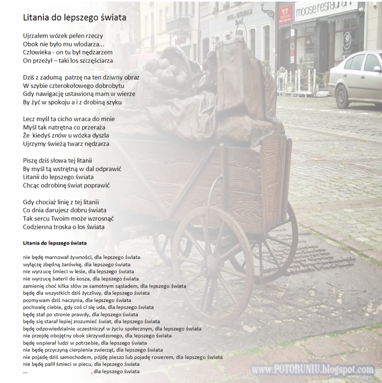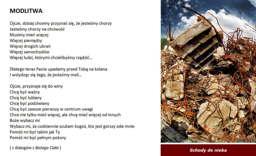 Ojcze, dzisiaj chcemy przyznać się, że jesteśmy chorzy Jesteśmy chorzy na chciwość Musimy mieć więcej Więcej pieniędzy Więcej drogich ubrań Więcej samochodów Więcej ludzi, którymi chcielibyśmy rządzić… Dlatego teraz Panie upadamy przed Tobą na kolana I wstydząc się tego, że jesteśmy mali… Ojcze, przyznaje się do winy Chcę być ważny Chcę być lubiany Chcę być podziwiany Chcę być zawsze pierwszy w centrum uwagi Chce nie tylko mieć więcej, ale chcę mieć więcej od innych Boże wybacz mi Wybacz mi, że codziennie szukam kogoś, kto jest gorszy ode mnie Pomóż mi być takim jak Ty Pomóż mi być pełnym pokory PS Obowiązkowo muszę coś wyjaśnić w związku z tym tekstem. Ale chwilowo to sekret :-)
