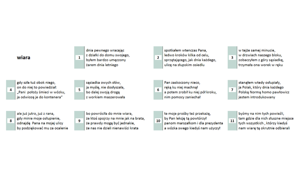 Chce coś wyjaśnić: Oglądając Boże ciało dwa fragmenty tego filmu odebrałem jako czysty przekaz poetycki. Zebrałem je w dwu tekstach, czyli Modlitwie i Zabiłem…. Nie jestem więc autorem tych tekstów. Myślę, że autorem jest autor scenariusza Mateusz Pacewicz. Te dwa teksty, to kontynuacja mojego pomysłu, aby na bazie wiernych dialogów z wybitnych filmów stworzyć tekst poetycki. To są takie moje dwie kolejne próby realizacji tego pomysłu. Poprzednie były w wierszach: PRZYSZŁY BÓL JEST CZĘŚCIĄ TERAŹNIEJSZEGO SZCZĘŚCIA? – to na podstawie filmu Cienista dolina Richarda Attenborough, oraz Jesteśmy parą skarpetek nie do pary... – na podstawie filmu Maudie. Pozdrawiam.