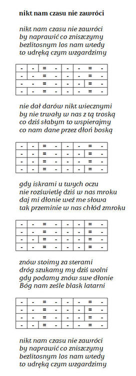 13. Dziś wróciłem jeszcze raz do wiersza: nikt nam czasu nie zawróci, był on tu podany troszeczkę wcześniej. Formę i rytm doprowadziłem w mojej skromnej opinii do "miód malina" :-) = to zgłoska akcentowana - to zgłoska nieakcentowana