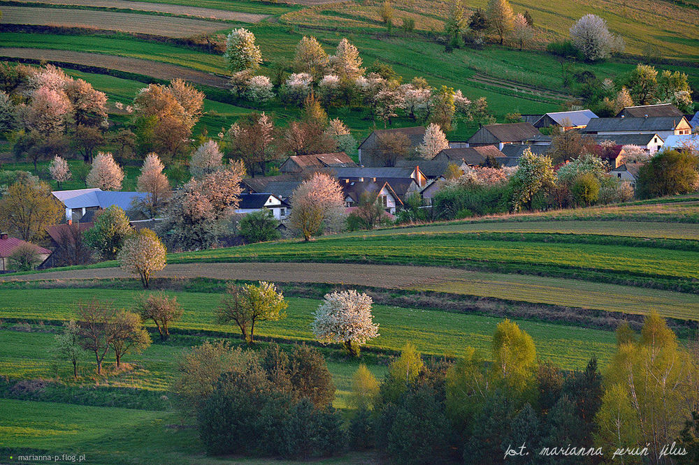 do pomysłu @jan_komułzykant Wioska w dolinie na wschód niesie domy, od zabudowań na północ, południe wąziutkie pola biegną paseczkami, nieregularnie przez wzgórza, przecudnie. Każde poletko jak wstążka falista w kolorach ziemi, zielonych odcieniach niekiedy deszcze częstują błękitem ściągniętym prosto z nadchmurnego nieba. Jednym wyraźnym pociągnięciem pędzla rześki wiatr pieści i maluje łany, wietrznie, a lekko złocienie mieszając, kładzie na żyta kłosowy aksamit. A miedze sterczą jak broda Szymszela, by pooddzielać piaski i rędziny włości zamożnych mieszkańców Roztocza bogatych w uśmiech, szczerych i gościnnych. W przepychu sadów, ogrodów warzywnych przy zboczu wzgórza rośnie stara brzoza, mchem porośnięty wokół cichy skrawek, to miejsce moje, często tam podążam. Siadam i marzę by zostać Rusałką, płatkami róży ozdabiam warkocze wokoło drzewa to kuszę, to tańczę, a później stopy w wodzie Świerszcza moczę. 16.11.2018r. -