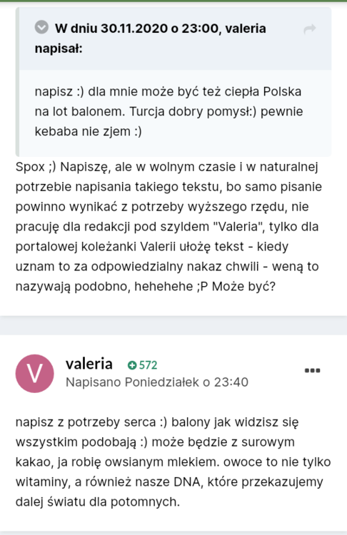 16. @valeria Zgodnie z naszym ustaleniem, napisałem ten wiersz "balonowy" którego sobie zażyczyłaś w dyskusji wcześniejszej i tutaj pod tym moim utworem, czy mam go wrzucić na portal? Jest sumienny i całkiem przyzwoity. Więc odpisz w chwili wolnej.