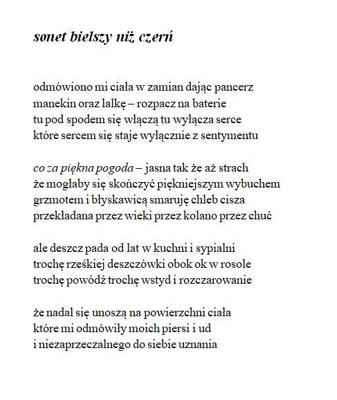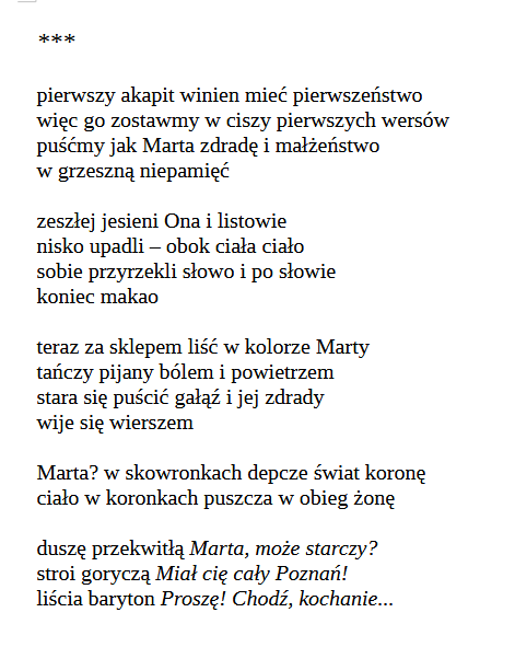 mówi polska – europa na tym osiedlu jestem ostańcem praw wyjechanych głów, łysych i szerokich jak maszt galery dresowych szelestów tylko nie dziękuj tylko nie przepraszaj holandia wciąga, wciąga szkocja polska: nie nadaje się do pracy w fabryce do zbierania głów kaparów i papryk jestem stworzony by się z wami bawić szparagi mówią: sezon już dobiega końca. a bloki są pełne staruszków cebuli marchwi pietruszki i klepsydr na tym osiedlu wieje wiatr wspomnienie sentyment pni lip brzóz z wyrytym: kocham Klaudię w sercu skaleczonym nożem