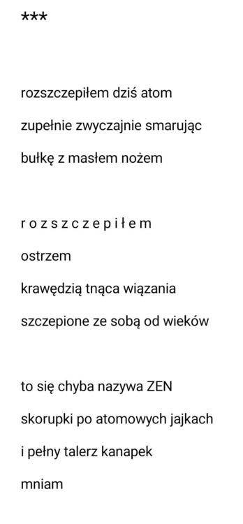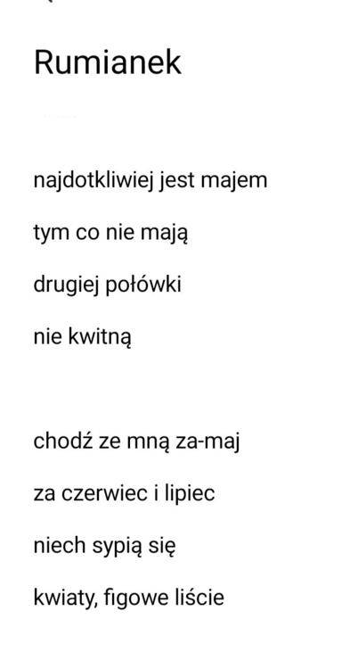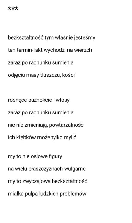 znowu płyniesz o poranku dłonią, prąciem, skórą, wierzchem znowu żabką, strzałką, pieskiem szybko, szybko - mam na siódmą szef się wkurwi, przestań wreszcie rozkosz gaśnie w autobusie słona słodycz na koszulce kapie do kontroli bilet