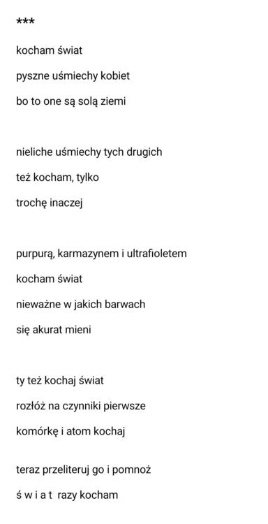 Chciałem stworzyć prywatny wszechświat Udostępniany tylko tym, którzy są zainteresowani Tym, których interesuje wszechświat publiczny, zapach gleby po deszczu i pastelowe barwy Dokładałem kartkę za kartką, rozszerzałem, budowałem objętość aż zabrakło mi papieru Teraz piszę na komputerze, jak wszyscy operuję cyfrowym makro i mikro kosmosem Zostało mi jeszcze 999 gigabajtów