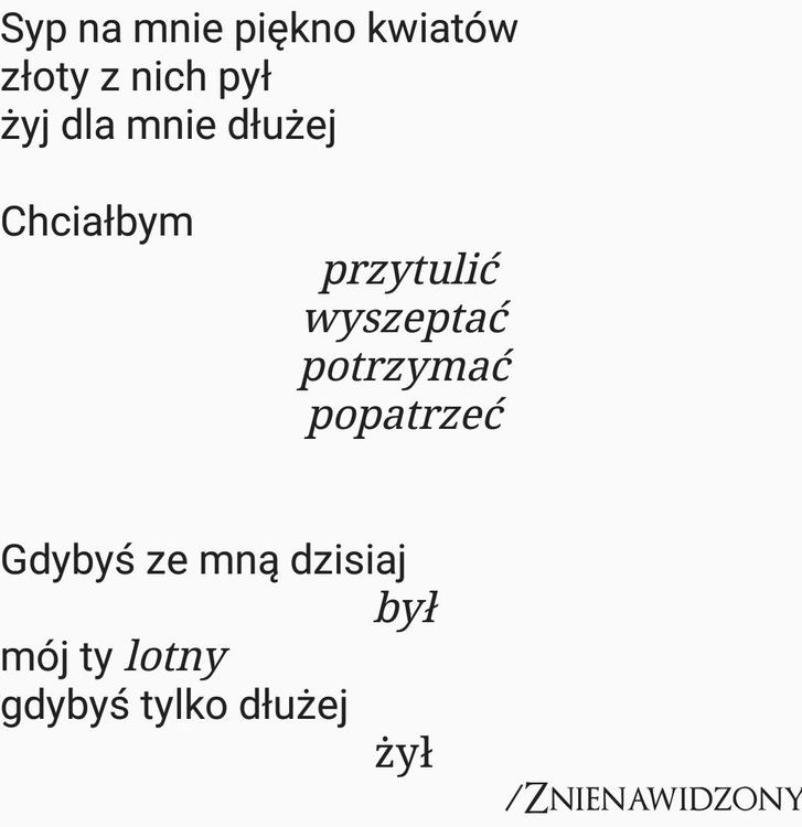 Zapomniałem się dwie czarne perły pełne słonej wody miałem Istoty każda z zimnym ogniem szła po mnie widziałem Płakałem bo zobaczyć u każdego na ustach szczery księżyc chciałem. /Znienawidzony