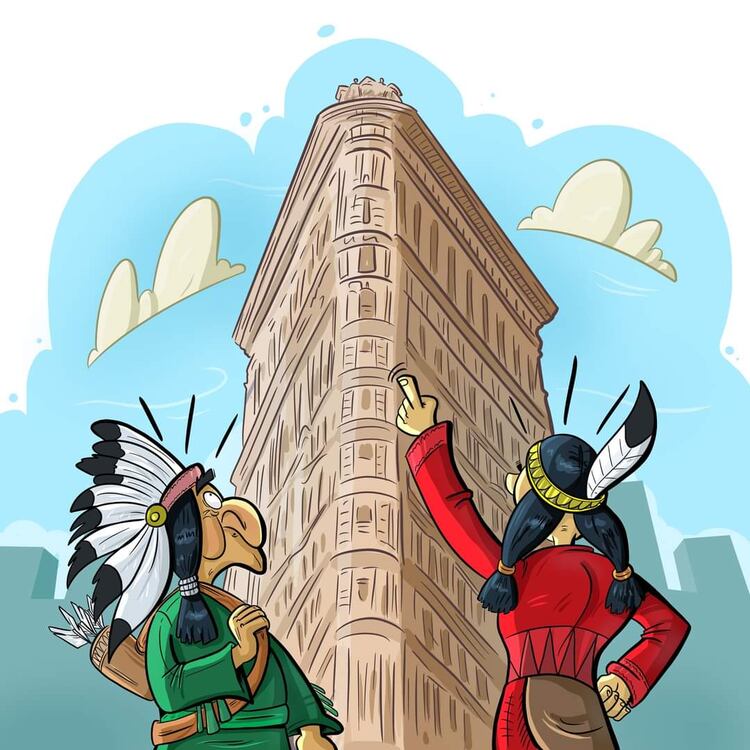 W Nowym Jorku, gdzie są chmur drapacze dnia pewnego gościli Apacze. Widząc bryłę żelazka*, zakrzyknęli do diaska, tu trafiają się również partacze. *Flatiron Building – budynek, którego bryła przypomina żelazko. Ilustracja: Krzysztof Kałucki