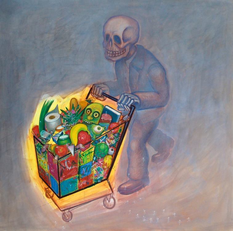1) Raz pewien zombie w supermarkecie (czyli wszędzie i nigdzie, jak wiecie) przyszedł po rozum do głowy, ale konsument zbiorowy go nie zabiera, bo się pogniecie. 2) Raz pewien zombie (któż wie gdzie to było) do supermarketu przyszedł ze śliną na brodzie, miał jedno w głowie: zjeść ludziom mózgi. Lecz kto wie czemu całą kolejkę ominął? 3) Raz homo sapiens, normalnie, po ludzku, do supermarketu wkroczył bez mózgu, zostawił go w domu – choć łeb miał jak globus ledwo mózg mieścił, co dopiero w wózku. "Przedostatnia wieczerza"