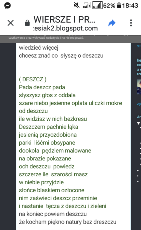 1. witam o to mój wiersz kto potrafi poprawić go { co czuje } moje życie tak mogę to nazwaćzapisane w tych gwiazdachbardzo trudne i zranione walczę z życiem taką wojnę mych uczuć nie opisze nikt bądż tu zawsze w sercu mym spytasz pewnie co dziś czujea ja ci odpowiem pustkę czuje strach ból rozgoryczenie tak dziś czuje smutek i uzdrowienie kto pokocha mnie tak szczerze kto wyleczy mą duszę w niebiepytania pytania i brak odpowiedzi nie dostałam moje zycie z puzzli poukładam w całość bez wahania czasem radość czasem smutek przytul mnie o to dziś proszę niech ta osoba mnie do końca życia wspiera takie me marzenia w głowie zapisane na blogu odebrane i czytane pewnie powiesz co za brednie a ja ci powiem w przyjażń wierzę i tak się stanie me życie kochane wołanie by noc zapadła bym spokojnie w nocy spała by tych nerwów nigdy nie miała stresu zabieranego i w życiu duzo złegoprzez 22 lata tu cierpiałam i może kogoś w mym życiu się doczekałaby mnie wspierała i o życie by oddałatakie słowa moje w pamięci zostawionena tym kończę wiersz ponury lecz nie koniec wiersza mego czekam aż ktoś pokocha wiersze z zycia mojego pozdrawiam i czekam na odpowiedzi ps Sandra Grzesiak