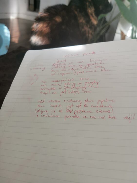 wymyśliła sobie to będzie kieszeń tam zamieszkam już na zawsze owinąłem ją nawilżoną chusteczką niech żyje z upodobaniem tak pomyślałem w mgnieniu uśmiechu żywiła się poezją bez umiaru i przystanku zupełnie jak świnia odwdzięczała się jadem przy pierwszej sposobności oddałem ją w prezencie w zakrwawionej nawilżonej chusteczce wiła się rytmicznie jakby była sercem