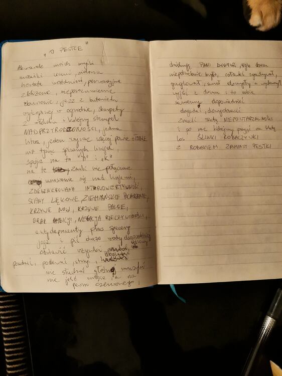 akwarele myśli mozaiki uczuć zielona herbata westchnień perwersyjne zbliżenie warkocz komety wykopanej w ogrodzie i kolejny stempel NADPRZYRODZONOŚCI jedna litera jeden wyraz więcej o tobie powie niż tysiąc zapisanych linijek spójrz na to "a" i "k" na te znaki niepołączone unoszenie się nad równoleżnikami zdegenerowana introwertywność, stany lękowe, ziemiańskie pochodzenie krzywe nogi koślawe palce niedobór ambicji, negacja rzeczywistości "antydepresanty plus spacery joga i pić dużo wody oligoceńskiej odstawić używki nasiona roślin posadzić podlewać strzyc i doglądać nie słuchać głośnej muzyki nie jeść czerwonego mięsa" dziękuję pani doktor tyle stresu człowiek niepotrzebnie miał zgadywał guglował i snuł domysły a wystarczyło wyjść z domu dopowiedzieć dogadać dowyobrazić zrzucić szatę NIEPOWTARZALNOŚCI i po raz kolejny przyjąć na klatę los śliwki robaczywki z robakiem zamiast pestki