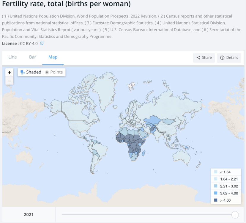 10. @Marek.zak1 Myślałem i uważałem do niedawna tak samo. Liczba dzieci urodzonych we wszystkich krajach spada nawet w KONGO, którego współczynnik wynosił dane na rok 2021 - 6.2 (dzietności) w piku bywało i prawie 8.0 Dlaczego jeszcze rośnie populacja ogólnoświatowa? Nie trudno zgadnąć - spada umieralność dzieci plus wydłuża się życie :DDD. Jedna grafika lepsza niż tysiąc słów.