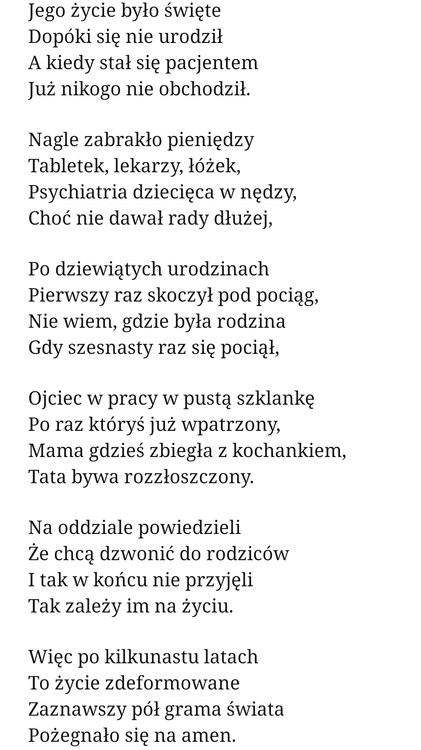 Jesteś remedium na całe cierpienie W tym świecie samookaleczonym, Gdzie wszystko wydaje mi się złudzeniem I chaos przytłacza mnie z każdej strony. Świadomość śmierci traci znaczenie, Chociaż tak boję się umierania, Liczy się tylko nasze współdrżenie I ciągły proces współodczuwania. Napiszę dla ciebie i tysiąc wierszy, Mikroelementów tworzących całość, Bo tak jak było mówione w pierwszym Zawsze ich będzie o wiele za mało.