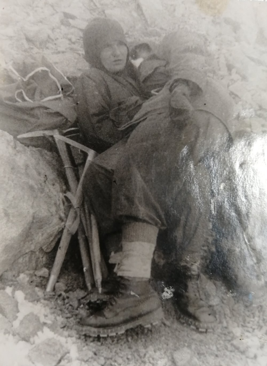 Poem Girl the Rock Climber (Skalolazka) by Vysotsky sung by him to his own tune arranged and performed by Georgiy Garanian and his orchestra Wiersz Wysockiego „Panienka Wspinaczka Skałkowa” („Skałołazka”), zaśpiewany przez niego do własnej melodii, zaaranżowanej przez Georgij'ego Garańana i wykonanej przez jego orkiestrę. By Vladimir Vysotsky GIRL THE ROCK CLIMBER Once I wondered,`What makes girls climb mountains?' (You conquered peaks by peaks, you longed to go on!) `Airview of Mount Elbrus is more astounding!` You just laughed at me, saying `Come along!` Since that time you`ve been for me the closest one, Mountain climber of mine, mountaineer of mine. When removing me from my first cleft in mountains You said no word, you just smiled awhile. Only then for those damn clefts I`d tumbled down, When I praised your meal, at our dinner time, I was twice boxed on the ears by you, my Brownie, Ate `my humble pie` whisp`ring all the time, `Oh, what a good and caring sweet girl you are! Mountain climber of mine, mountaineer of mine!` Every time when searching for me as my rescuer You often swore at me as my true sweetheart. So teamed up with you while climbing mountains, (I don`t understand your austerity!) You enjoyed to secure me, you did it proudly, Mountaineer of mine, superflexible! `Oh, what nasty and unkind for me you are! Mountain climber of mine, mountaineer of mine!` Every time when searching for me as my rescuer You often swore at me like a spoiled child. By my eyelids I hanged on that naked wall. A stone`s throw was from your hands` touch. I thought,`If I reach for her, I`ll beg `Girl, call a halt!` But when I fell from there, I had time to shout, `Oh, what a good and caring sweet girl you are! Mountain climber of mine, mountaineer of mine! We are climbers of a piece from now on, We are bound up with one climber`s rope`. <1966> Poem Girl the Rock Climber (Skalolazka) by Vysotsky recited by Artyom Pir-Budaghian, a teacher of the Russian language and literature from Armenia Wiersz „Panienka Wspinaczka Skałkowa” („Skałołazka”) recytowany przez Artioma Pir-Budagiana, nauczyciela języka rosyjskiego i literatury z Armenii Władimir Wysockij SKAŁOŁAZKA Ja sprosił cebia: "Zaciem idioce w gory wy?" (A ty k wierszine szła, a ty rwałasia w boj) "Wied' Elbrus i s samolota widno zdorowo!" Rassmiejałas' ty i wziała s soboj. I s cech por ty stała blizkaja i łaskowaja, Alpinistka moja, skałołazka moja! Piervyj raz mieńa iz trieszcziny wytaskiwaja, Ułybałaś ty, skałołazka moja. A potom, za eti proklatyje treszcziny, Kogda użin twoj ja nachwaliwał, Połucił ja dwie korotkije zatrieszcziny, No nie obidiełsia, a prigowariwał: Och, kakaja że ty blizkaja i łaskowaja, Alpinistka moja, skałołazka moja! Każdyj raz mieńa po trieszczinam wyiskiwaja, Ty braniła mieńa, alpinistka moja. A potom na naszem woschożdienii, (Nu, pociemu ty ko mnie niedowierciwaja?!) Strachowała ty mieńa s naslażdienijem, Alpinistka moja gutapierciewaja. Och, kakaja ty nieblizkaja, nielaskowaja, Alpinistka moja, skałołazka moja! Każdyj raz mieńa iz propasti wytaskiwaja, Ty rugała mieńa, skałołazka moja. Za toboj tianułsia iz posledniej siły ja, Do cebia uże mnie rukoj podać. Wot dolezu i skażu: "Dowolno, miłaja!" Tut sorwałsia wniz, no uspieł skazać: Och, kakaja że ty blizkaja i łaskowaja, Alpinistka moja, skałołazka moja! My ceper' s toboj odnoj sud'boju swiazany Stali oba my skałołazami. <1966> Alpinistka Maria Gotovtseva. The famous poem about girl the cliffhanger is dedicated to her. Wspinaczka skałkową Maryja Gotowcewa. To jej dedykowan słynny wiersz "Skałołazka". Wysocki met that beautiful sportswoman on the set of the film "Vertical" in 1966. She was a stunt for the actress Margarita Kosheleva in the dangerous scenes. Wysocki poznał tę piękną sportsmenkę na planie filmu „Vertical” w 1966 roku. Była popisem dla aktorki Margarity Koshelevą w niebezpiecznych scenach. The camp of the film crew was located in the Caucasus Mountains at the so-called "Shelter of the Germans" (The former base site of the Wehrmacht mountain division "Edelweiss" during the WW2). It is a huge plateau from where you can reach the different summits. Again, the views are amazing. Work on the film coincided with the death of Georgiy Żiwluk, one of the best climbers in the Armed Forces. Yura saw that the multi-ton stone plate was approaching him from above, and pressed against the rock as much as he could. There were no visible injuries on Yura's body, but being a doctor, he realized that his internal organs were damaged and told his partner Askold Bitnov: "I'll die within 5 minutes." And it happened just so. 1.Gebirgsdivision insignia Insygnium dywizji strzelców górskich Wehrmachtu „Edelweiss”. The Wehrmacht & Ahnenerbe Joint Mission Vs. Red Army & Russian indianas joneses in the Caucasus failed to gain its purpose, though the swastika flag had been waving o'er Mount Elbrus for a number of years. Wspólna misja Wehrmachtu i Ahnenerbe Vs. Armii Czerwonej i rosyjskich indian jonesów na Kaukazie nie osiągnęla swojego celu, chociaż flaga ze swastyką powiewała nad Elbrusem od kilka lat. Obóz ekipy filmowej znajdował się w górach Kaukazu przy tak zwanym „Schronisku Niemców” (dawna baza dywizji strzelców górskich Wehrmachtu „Edelweiss” w czasie II wojny światowej). Jest to ogromny płaskowyż, z którego można dotrzeć na różne szczyty. Znowu widoki są niesamowite. Praca nad filmem zbiegła się w czasie ze śmiercią Georgiego Ziwluka, jednego z najlepszych wspinaczy w Siłach Zbrojnych. Jura zobaczył, że wielotonowa kamienna płyta zbliża się do niego z góry, i, jak mógł, przyciśnięł do skały. Na ciele Jury nie było żadnych widocznych obrażeń, ale będąc lekarzem, zdał sobie sprawę, że jego organy wewnętrzne są uszkodzone i powiedział swojemu partnerowi Askoldowi Bitnovowi: „Mam 5 minut życia”. I tak się st