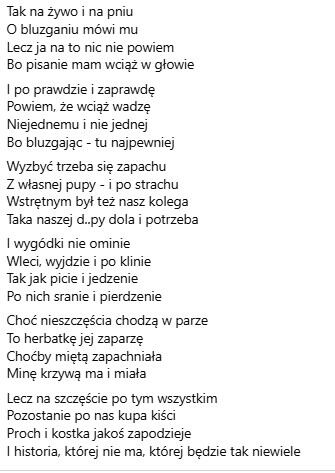 Cmokając ksiądz komentuje sejmową debatę Ten ustawę popiera - lobbysta Tamten czyta poprawkę i się zapiera Żaden kościoła nie popiera i nie wybiera Choinka, stanęło na tym że świętować będziemy cudaki - bombkami i za usznymi temblaki Bo cierpienia usz można dostać gdy mówi osioł do osla. My to jednak nie ja - zausznie i zaocznie przemilczę to wszystko już tylko niezwłocznie. Bo zwłok nie oddam darmo jeno księdzu bo mi się od tego tak jakby zmarło.