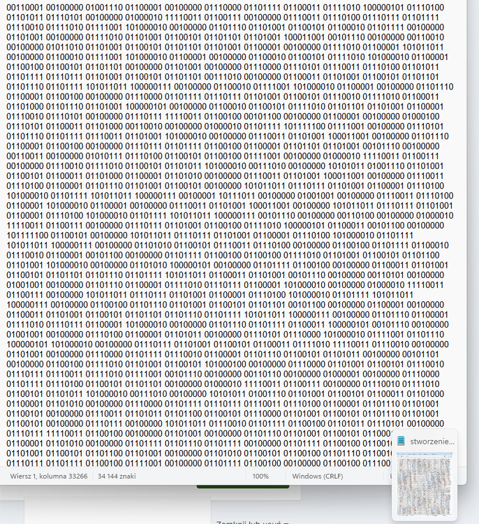 A teraz wytłumaczę, od czego zaczął się mój proces myślenia? Zapewne uważam, że ma on ścisły związek z poprzednim wierszem, co zaowocowało dalszymi poszukiwaniami. Oto one: 127x480 px (pikseli) 127x 480 = 60960 pikseli 1 piksel to 3 bajty, czyli w przestrzeniach kolorów RGB: R= red (czerwony) G= green(zielony) B= blue( niebieski) __________________________ Każdy bajt składa się z siedmiu albo ośmiu bitów, na przykład: 01010101 | 11001100 | 01010000 - to trzy bajty, które można zinterpretować jako cyfry, znaki interpunkcyjne i litery (duże i małe) oraz inne znaki! _______________________________ 60960 pikseli - ile ma bajtów? 60960x 3 bajty = 182 880 bajtów 182800 x 8 = 1 463 040 bitów (1463040 znaków binarnych) Z tej całości udało mi się odczytać, zaledwie 1% _____________________________________________ 'est sigillum veritatis. - Znak równości jest pieczęcią prawdy 'Verbum sine spatio non resonat. -słowo bez przestrzeni nie wybrzmiewa Jak to rozumieć? Jeśli pomyślimy o tym z szerszej perspektywy – patrząc z lotu ptaka, wszystko zaczyna nabierać większego sensu! Widać to na miniaturze notatnika, wewnątrz którego zapisałem( zapisany został) ciąg 0–1, inspirowany pierwszą stroną Księgi Rodzaju – pojawia się tam efekt pareidolii. Naprawdę robi się ciekawiej... -