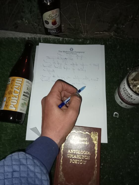 / poezja i proza zarazem - moja druga strona medalu / Zacznę od tego, jak antykwariat złapał wiedzę liter w sieci, by później rydwan tarzał kamyczki rozrzucane w zamieci; tylko jedna, twarda przez oko wypadła oprawa, i kamieniem w okno zapukała I coś mnie tknęło by wyjść na zewnątrz Wzdłuż drogi, na ziemi leżała i błagała, bym ją podniósł - otrzepawszy z kurzu ujrzałem perełkę, i zabrałem do domu; z resztą, oczami zobaczycie na zdjęciu - nocą siedziałem na sztucznym trawniku wśród wyrastających maków, pisałem zdarzeniem zainspirowany, tegoż dnia na wsi miało ono miejsce I widzicie: piszący się sam Święty Graal, wychodzi słowami spływając na papier, uwieńczony został bez goryczy miodem... Parafraza: Na drugi dzień, zapukałem do domostwa sąsiadki, która w trakcie naszej rozmowy powiedziała mi, że jej koza popsuła się; panie kochany - deficyt węgla i drożyzna powoduje, iż wszystkiego się pozbywam, sprzedaję na rzecz ciepła jakiego brakuje Oznajmiła staruszka... Bez zastanowienia, moje ja! Przypomniało, że trzymam serce nie tylko dla poezji I V "The best and most beautiful things in the world cannot be seen or touched, but just felt in the heart" -