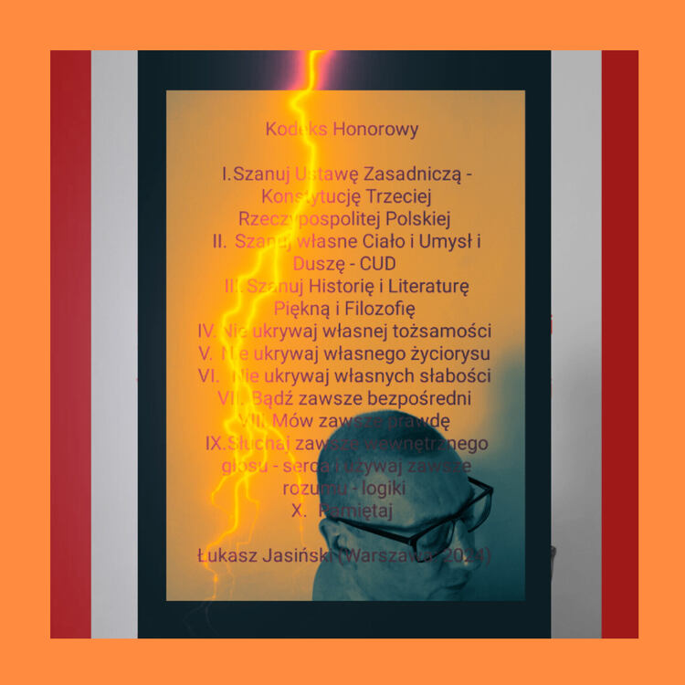 Kodeks Honorowy * l. Szanuj Ustawę Zasadniczą - Konstytucję Trzeciej Rzeczypospolitej Polskiej II. Szanuj własne Ciało i Umysł i Duszę - CUD III. Szanuj Historię i Literaturę Piękną i Filozofię IV. Nie ukrywaj własnej tożsamości V. Nie ukrywaj własnego życiorysu VI. Nie ukrywaj własnych słabości VII. Bądź zawsze bezpośredni VIII. Mów zawsze prawdę IX. Słuchaj zawsze wewnętrznego głosu - serca i używaj zawsze rozumu - logiki X. Pamiętaj *więcej informacji Państwo znajdą w następujących esejach: "Komentarz - komentarz odautorski" i "Mój drogi świecie" - Autor: Łukasz Jasiński (Warszawa: 2024)