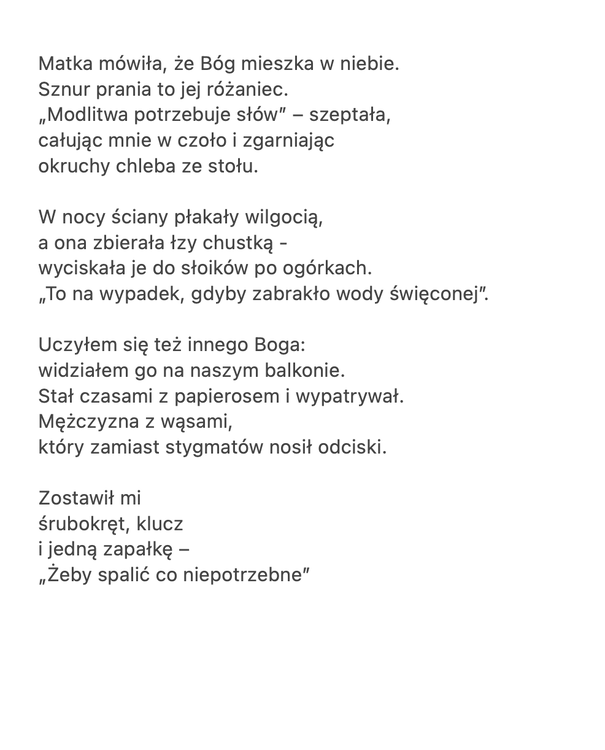 16. @Stary_Kredens Kusiło, by może troszkę dopowiedzieć, jednak jestem zwolennikiem otwartych przestrzeni, które dają wiele różnych odczuć, interpretacji. I tak - ta jedna zapałka jest swoistym kluczem tutaj. Dziękuję za komentarz.