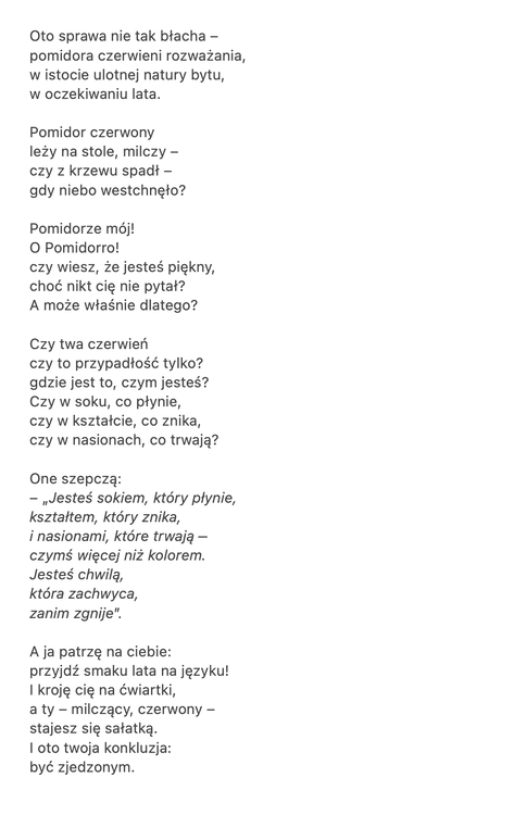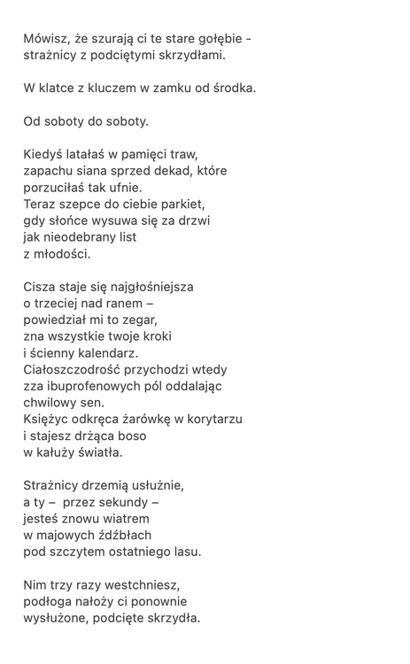 18. @piąteprzezdziesiąte Dziękuję za adwokaturę, alę już przyznałam się do winy, za którą muszę odpokutować, ale jeszcze nie wiem jak. Pozdrawiam! Ja Ciebie w żadnym wypadku nie bronię :) Stwierdziłem jedynie, ze w/g mnie spełnia kryteria tzw. gendai haiku i jako takie mieści się w konwencji, no ale ja jestem tych, którzy uważają, że puryści odwołujący się do "klasycznej" formy, jak i zasad określających treść powinni zacząć pisać w oryginale - wtedy to będzie "klasyczne haiku", bo klasyczność haiku w wersji nie-japońskiej to bardziej umowa społeczna niż realna kontynuacja tradycji :) Sam fakt, że gendai haiku (czyli - powiedzmy - współczesne haiku) w Japonii od dawna wyłamuje się ze schematu 5-7-5 i kigo, pokazuje, że „puryzm” poza kontekstem językowym staje się czymś w rodzaju estetycznej nostalgii. Zatem, jeśli ktoś chce prawdziwej „klasyczności”, powinien pisać po japońsku, z całym kontekstem lingwistycznym i kulturowym. A jeśli nie, to już grząski grunt interpretacji, gdzie nawet haiku Basho w przekładzie staje się czymś innym. Kończę, bo ileż można pisać o 5-7-5 ;) Broń się! Pozdrawiam.
