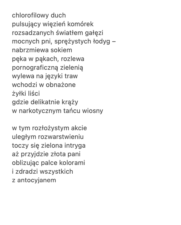 8. Tekst jest bardzo ciekawy. Podoba mi się też sam proces (wersje) - intencjonalnie bądź nie, nie ma to tutaj znaczenia - wyszedł ciekawy eksperyment, jak rzeczywistość wpływa na proces twórczy sprawiając, że celem może nie być "treść ostateczna", a raczej jej ewolucja w czasie. Sam eksperymentuję czasami, czy to z formą, czy właśnie z procesowaniem tekstu (i znaczeń) na osi czasu. Dla tego wszystko razem, włącznie z publikacją różnych wersji, odnajduję jako intrygujący, pobudzający zabieg. Pozdrawiam.