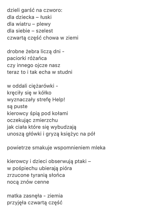 @Magdalena czad! Forma jest ok, czytam to co prawda po swojemu: ja jestem kanciasta i bez ogłady ślepa „gestów delikatnych ludzi co powietrzu siadły" na tacy głodna nie do nadrobienia pośród waszych znaczeń żarłoczna pierwsza na liście tak wiele i tak nie do znaczenia Ale to drobiazg. Wrzucaj na gotowe - świetne, gratuluję!