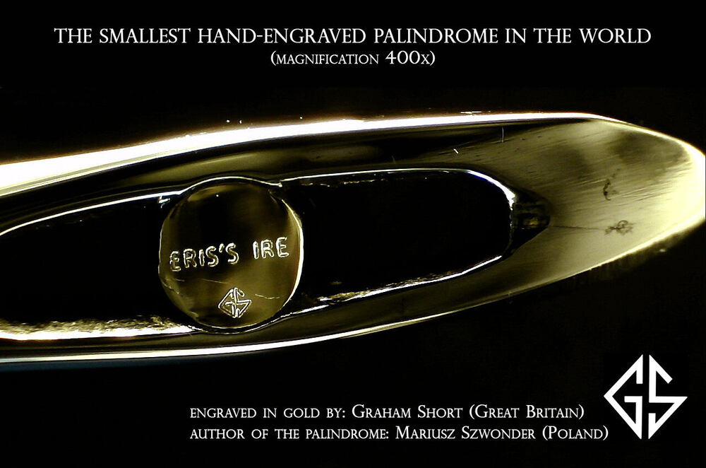 Wyobraźmy sobie niepozorne ucho igielne, a w nim grudkę złota. Ale niezwykłą - bo to właśnie na niej zapisano najmniejszy palindrom świata, widoczny dobrze pod mikroskopem w powiększeniu 400-krotnym. Nie, nie jest to efekt pracy maszyny, lecz mistrza nad mistrzami - Grahama Shorta z Wielkiej Brytanii. Graham Short jest żywą legendą. Zasłynął on m.in. tym, że wykonał napis na ostrzu brzytwy. Zamówienia składa u niego m.in. rodzina królewska, a dzieła można podziwiać w kilku galeriach na świecie; ceny tychże dzieł sięgają kilkudziesięciu tysięcy funtów. Oto link do strony artysty: https://www.graham-short.com/ Miło jest mi poinformować, że tym razem Graham Short wygrawerował krótki palindrom mojego autorstwa, pochodzący z książki "Pomału żaba żuła mop" (którą udostępniłem wcześniej na tym portalu). "ERIS'S IRE", czyli gniew bogini niezgody zostanie zaprezentowany już wkrótce m.in. w programie TVP Polonia Słownik polsko-polski. A zapewne jeszcze szybciej na tym forum, gdyż każdy palindromista chciałby ujrzeć najmniejszy palindrom na świecie, prawda? Życzę odrobiny cierpliwości, Mariusz Szwonder