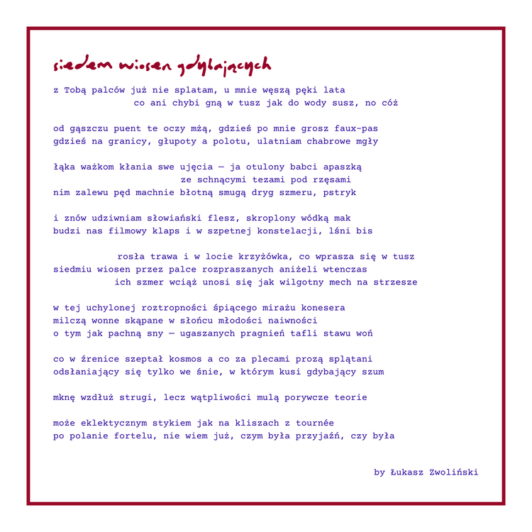 by widzieć Cię w kolorze, muszę zamknąć oczy tam, gdzie godność i wstyd zagryza wargi snom spektakl, co miał przewiać suwerenność metr na metr nie drzyj się na mnie, bo serpentyną jestem ja mu oddałbym noc, po nim ósmy dzień tygodnia narwany od szlamu wiosen utknąłem gdzieś gdzieś na granicy głupoty a polotu