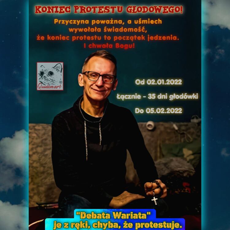 https://anchor.fm/quidem/episodes/35-dzie---INFORMACJA-O-PRZERWANIU-PROTESTU-GODOWEGO-e1e04a8 Cześć, tu Quidem. Uśmiechnięty, zmęczony, poważnie traktujacy podjęte zadanie, ale ta myśl o końcu głodu... Ten uśmiech.. Posłuchajcie dlaczego i jaka była spontaniczna reakcja. Dziekuję WSZYSTKIM słuchaczom, gosciom, sympatykom za obecność w największym wyzwaniu wytrzymałosciowym mojego zycia. Następny odcinek dopiero w 2 połowie następnego tygodnia. Będzie tam podsumowanie i moje spostrzeżenia, a może cos jeszcze dodam ekstra... Na przykład słynnego, ale jeszcze nie zaprezentowanego kota Logikemona? Coś na pewno dołaczę... Jestem trochę zmartwiony powodem, ale teraz tylko cieszę się, mimo, że zostałem praktycznie zmuszony do zakończenia... Przez los? Cieszę się tym wszystkim, co dobrego znalazłem w tej sytuacji. JEDZENIE! oraz fakt, że znowu nie mam pojęcia kompletnie ile spodziewam się zyć, tak w ogóle ... ;-) Zapraszam i dziękuję jeszcze raz QQ A to link do fotki z moim pierwszym daniem od początku praktycznie roku :-D https://imgur.com/a/4RhsNkG -