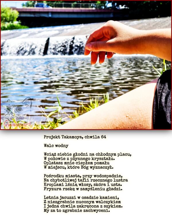 Projekt Takamoya, chwila 64 Wciąż siebie głodni na chłodnym placu, W połowie z płynnego kryształu. Oplatasz mnie ciepłem pomału W miejscu, które Bóg wyznaczył. Pośrodku miasta, przy wodospadzie, Na chybotliwej tafli rzecznego lustra Kroplami lśnią włosy, skóra i usta. Fryzura rzekę w zamyśleniu gładzi. Letnia jacuzzi w osadzie kamieni, Z niezgrabnie nuconym walczykiem I jedna chwila zakręcona z szykiem. My za to zgrabnie zachwyceni.