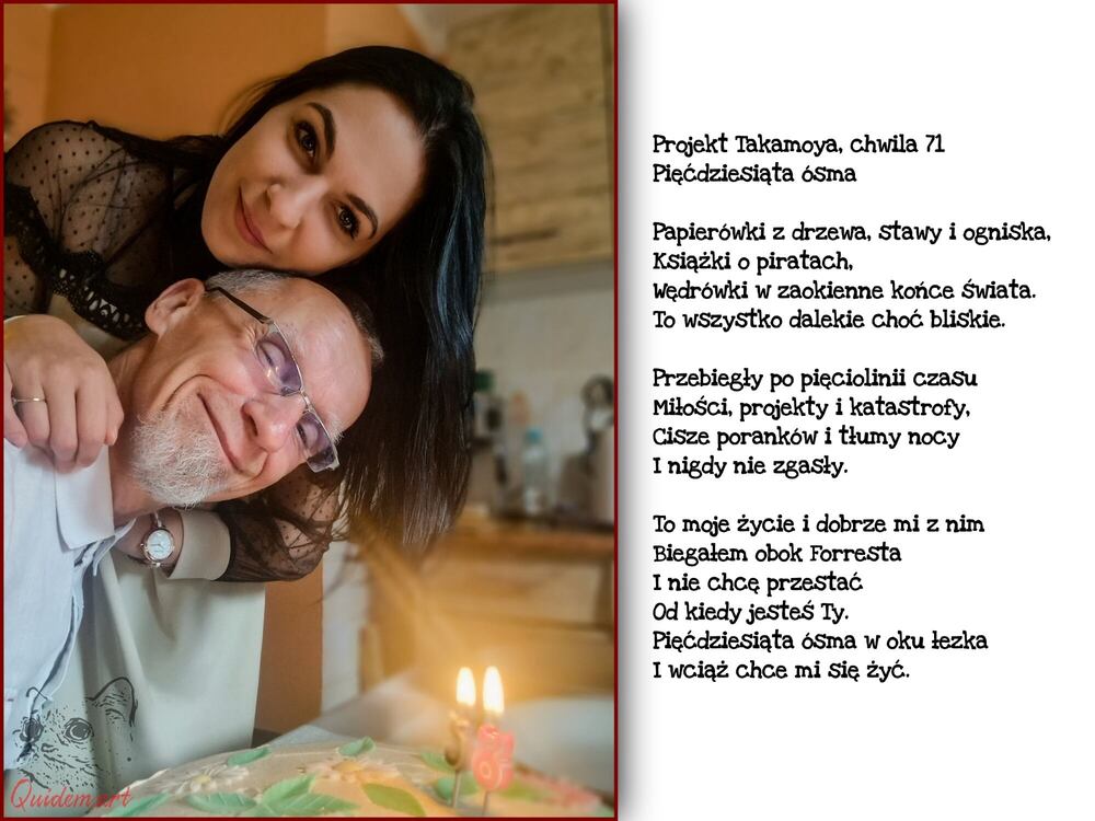 Projekt Takamoya, chwila 71 Papierówki z drzewa, stawy i ogniska, Książki o piratach, Wędrówki w zaokienne końce świata. To wszystko dalekie choć bliskie. Przebiegły po pięciolinii czasu Miłości, projekty i katastrofy, Cisze poranków i tłumy nocy I nigdy nie zgasły. To moje życie i dobrze mi z nim Biegałem obok Forresta I nie chcę przestać Od kiedy jesteś Ty. Pięćdziesiąta ósma w oku łezka I wciąż chce mi się żyć.